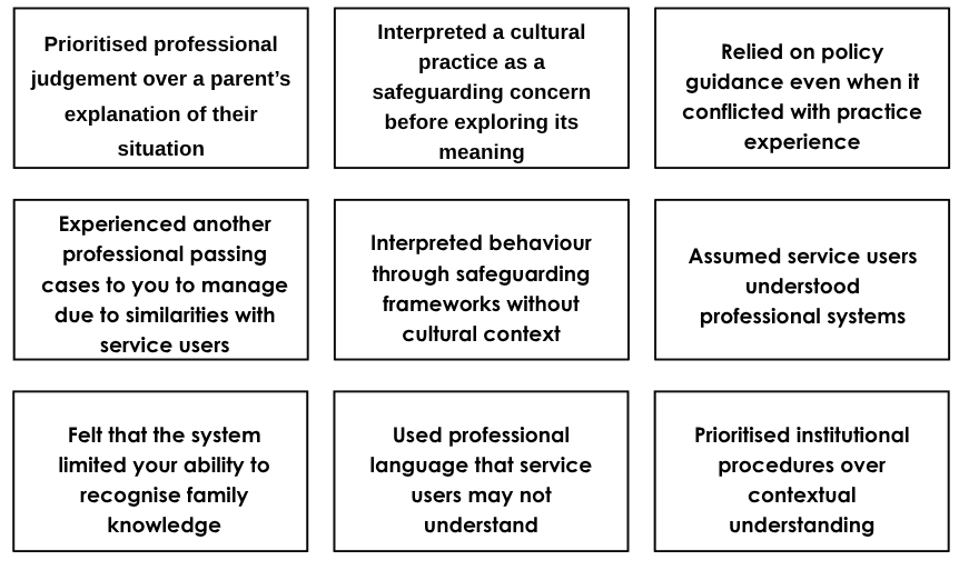- The “western lens” vs. cultural customs: Participants reflected on how a lack of cultural understanding can lead to varying safeguarding responses in a Western context and how behaviour can be misinterpreted without specific cultural knowledge.